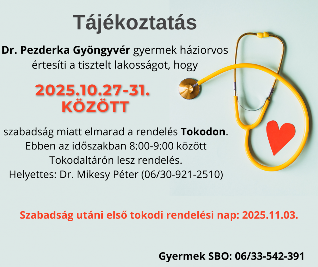 Dr. Pezderka Gyöngyvér október végén szabadságon lesz