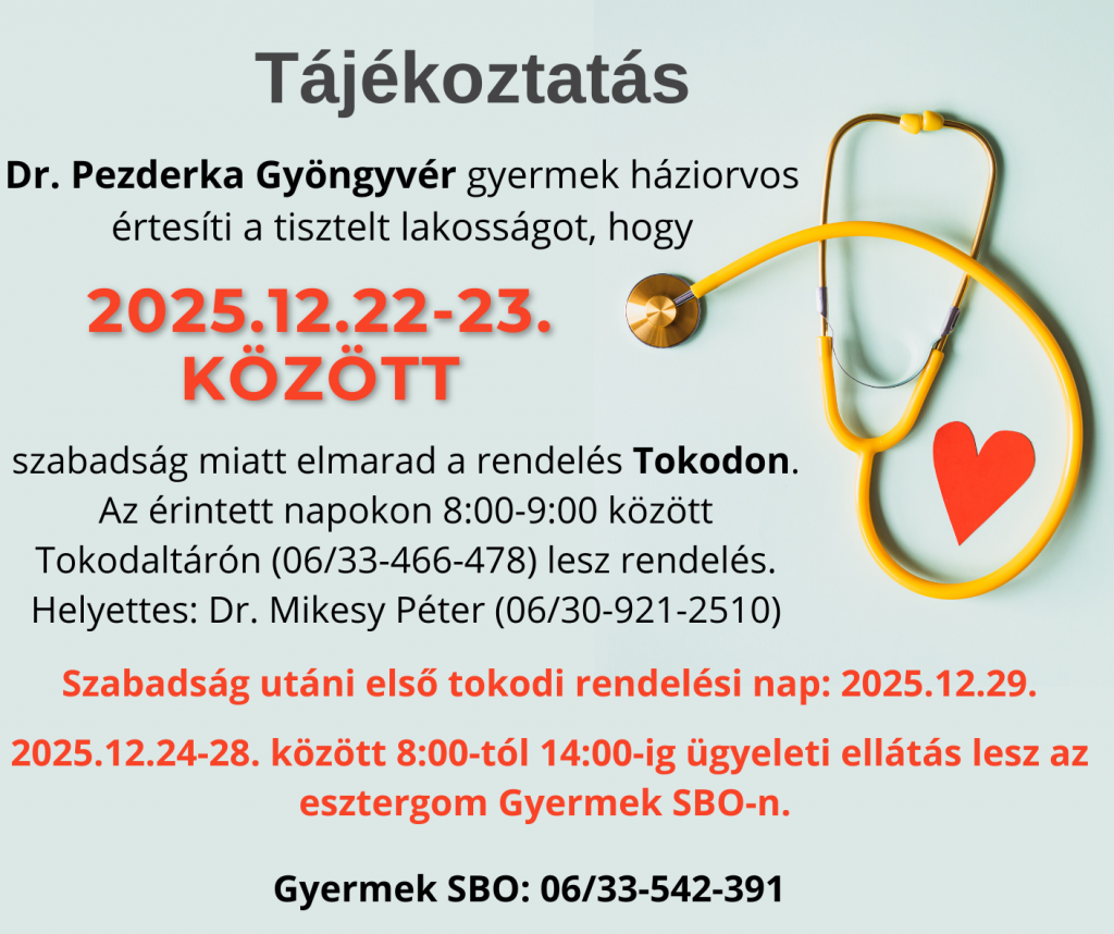 Elmarad december 22-23-án a gyermekorvosi rendelés Tokodon