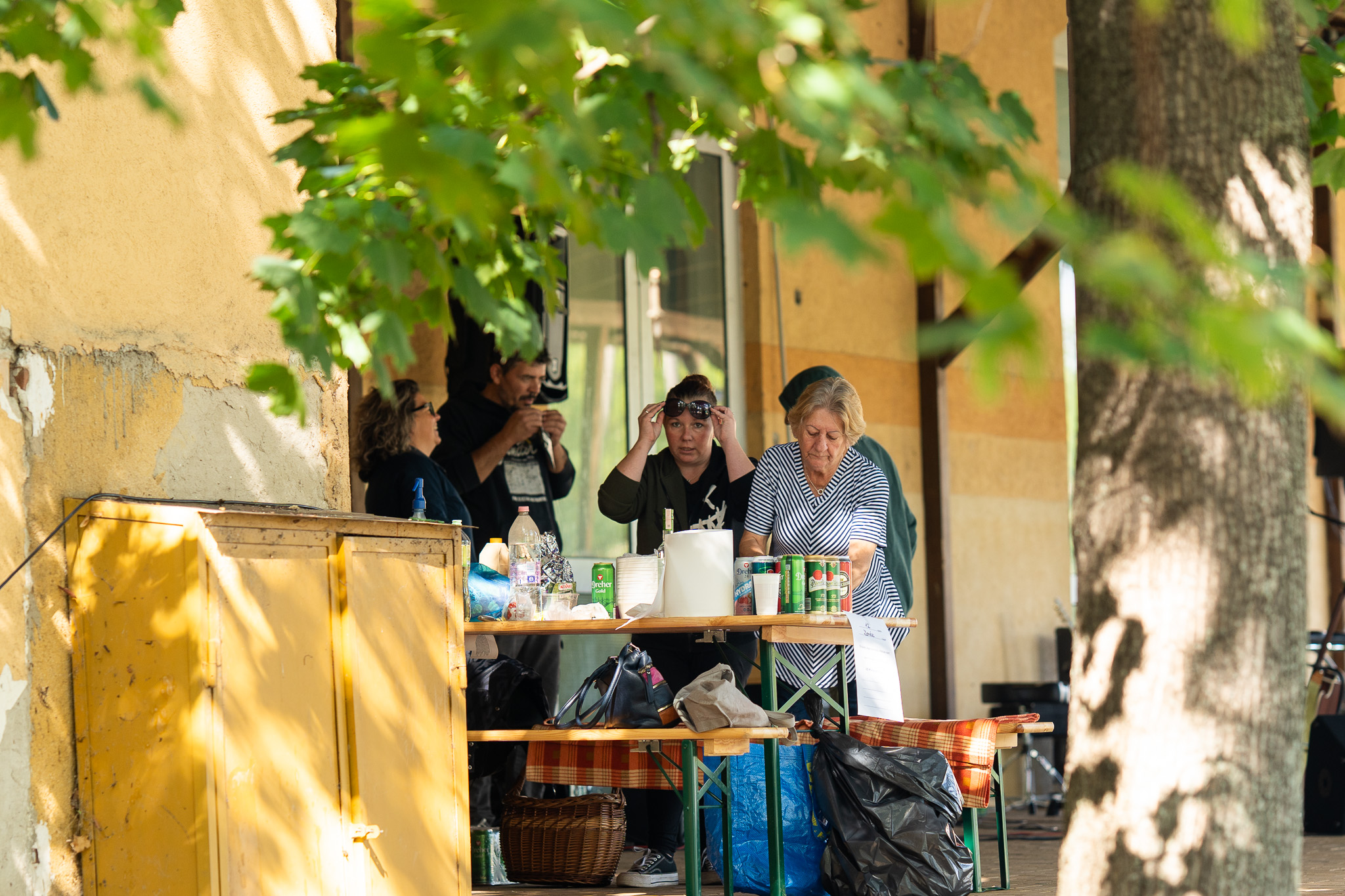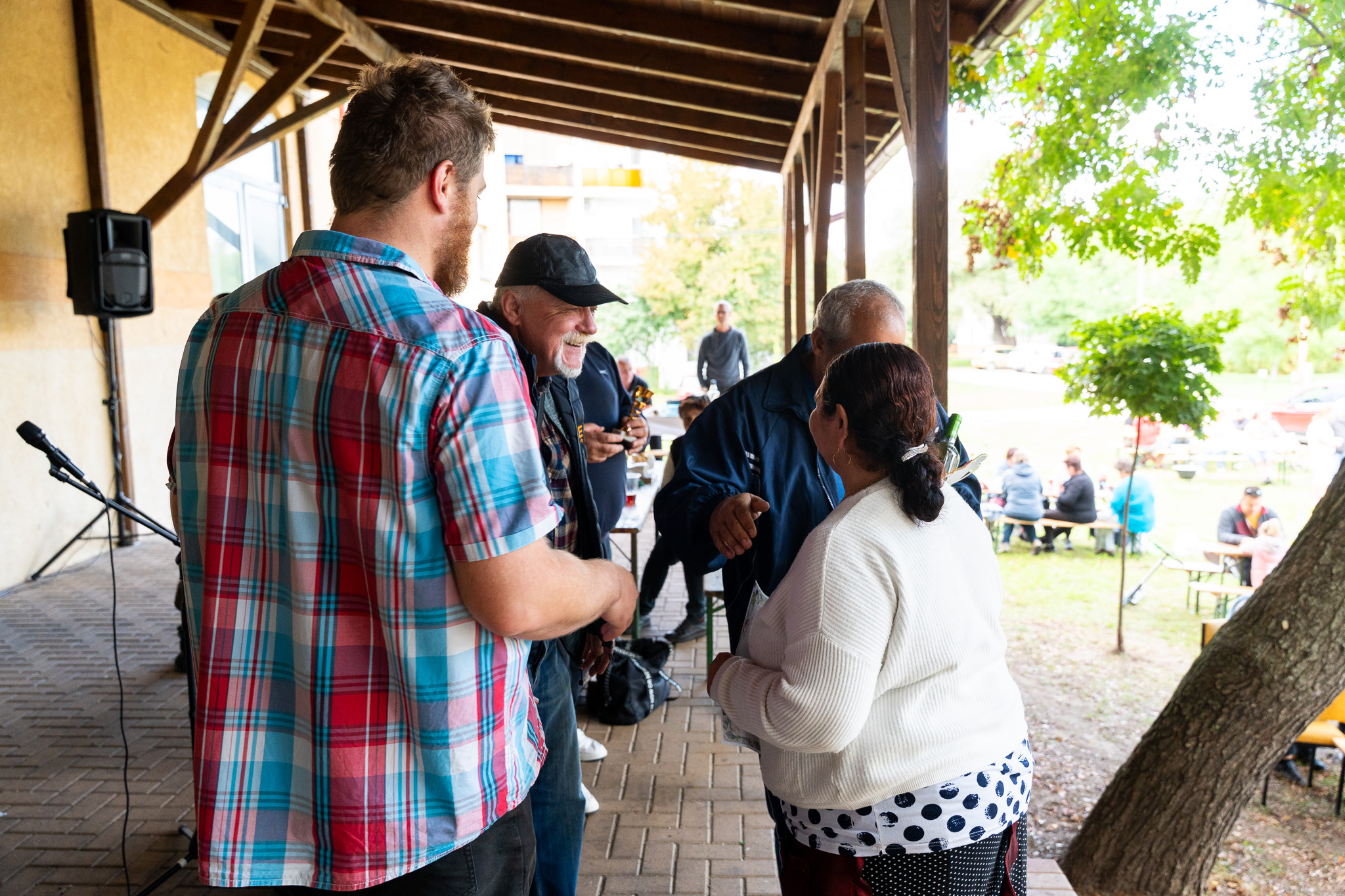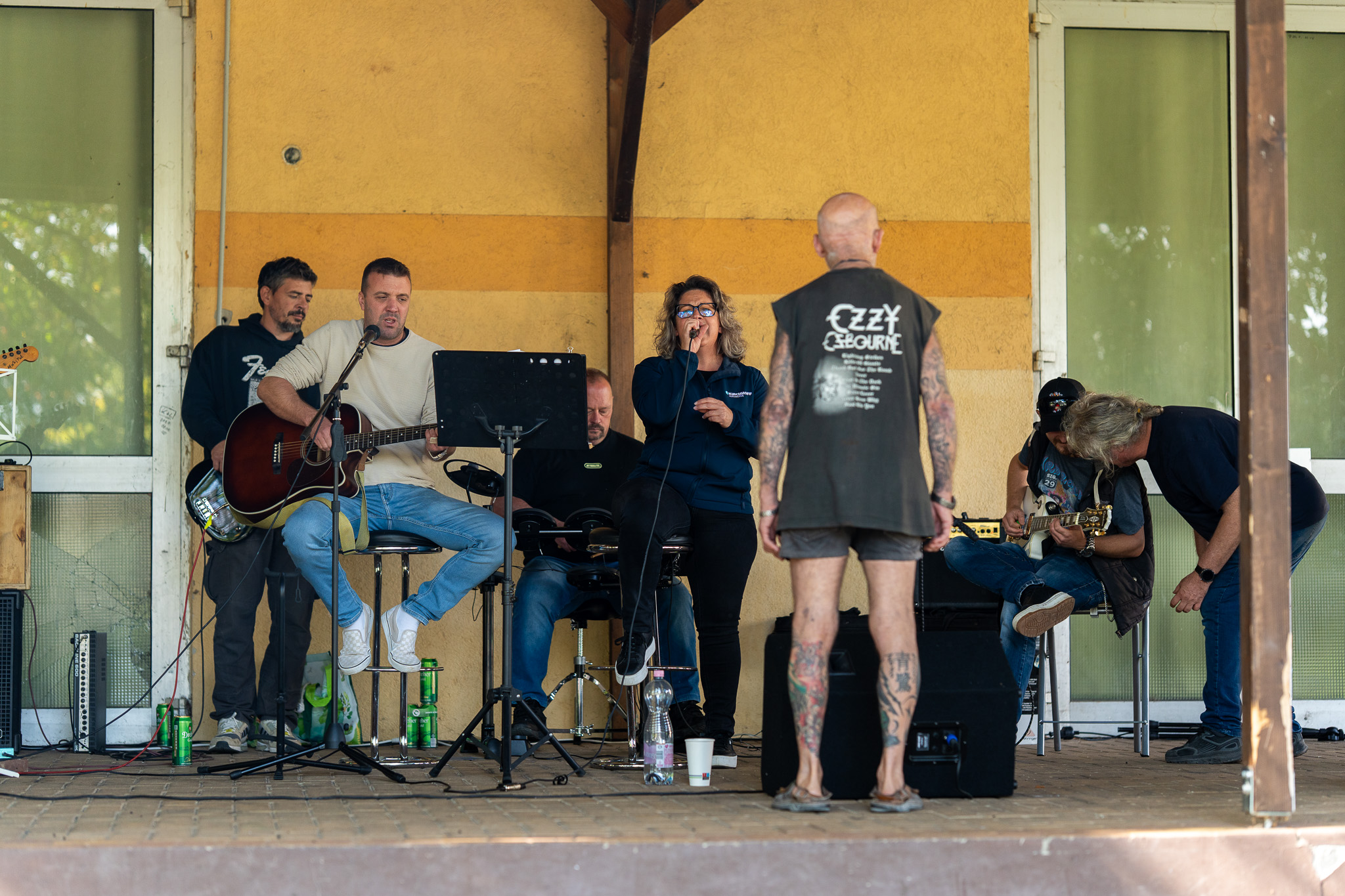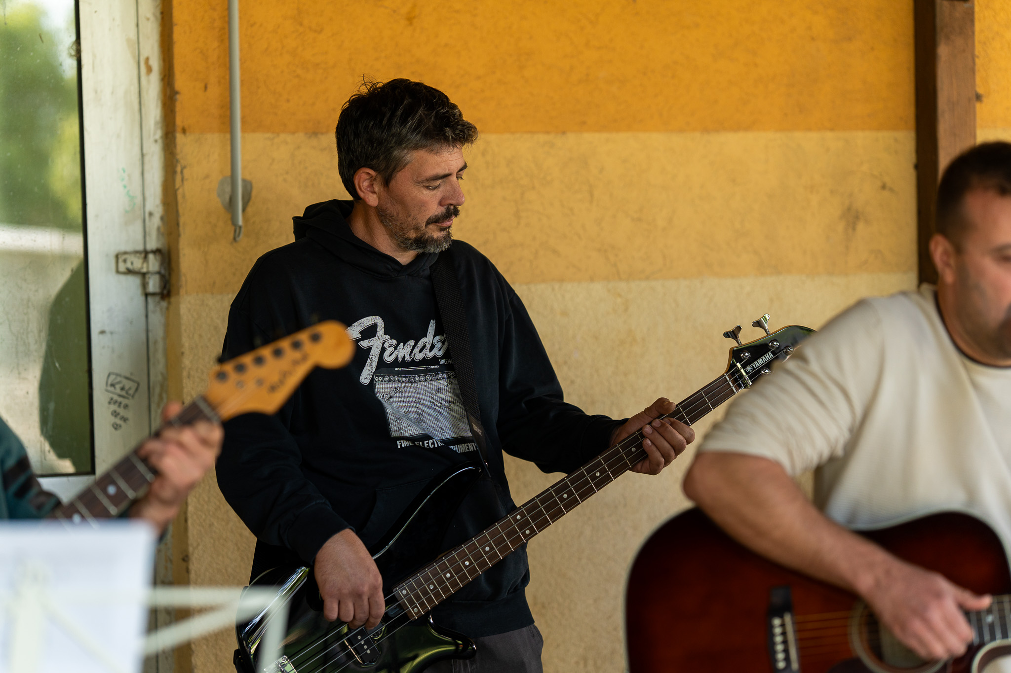 Közben a teraszon is megkezdődött a zenészek készülődése, hiszen idén is zenei csemegével készültünk a résztvevők számára. Tavaly Nagy Márton és Körösladányi Zoltán műsorát, valamint a munkásszállón lakó filippínó vendégmunkások zenéjét élvezhettük. Idén új formáció lépett fel: a Jatagán, a Gran’Gents, a Big Jump és a Bluzment zenekarok tagjaiból állt össze egy különleges csapat. Ők nemcsak zenéltek, hanem a főzőversenybe is beneveztek. Bár az ételüket nem kóstoltam, a zenei repertoárjukat imádtam – és remélem, ezzel nem voltam egyedül.