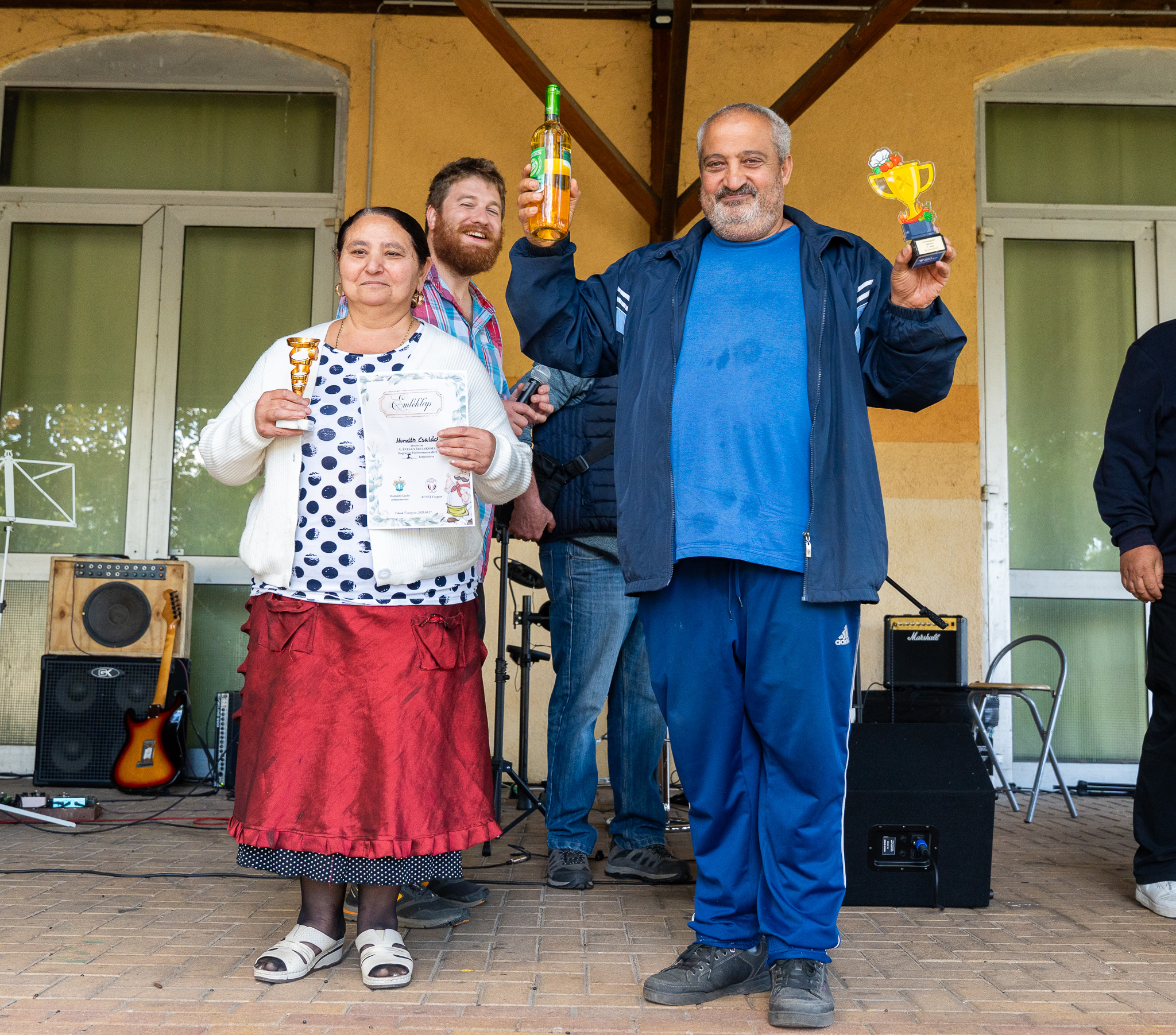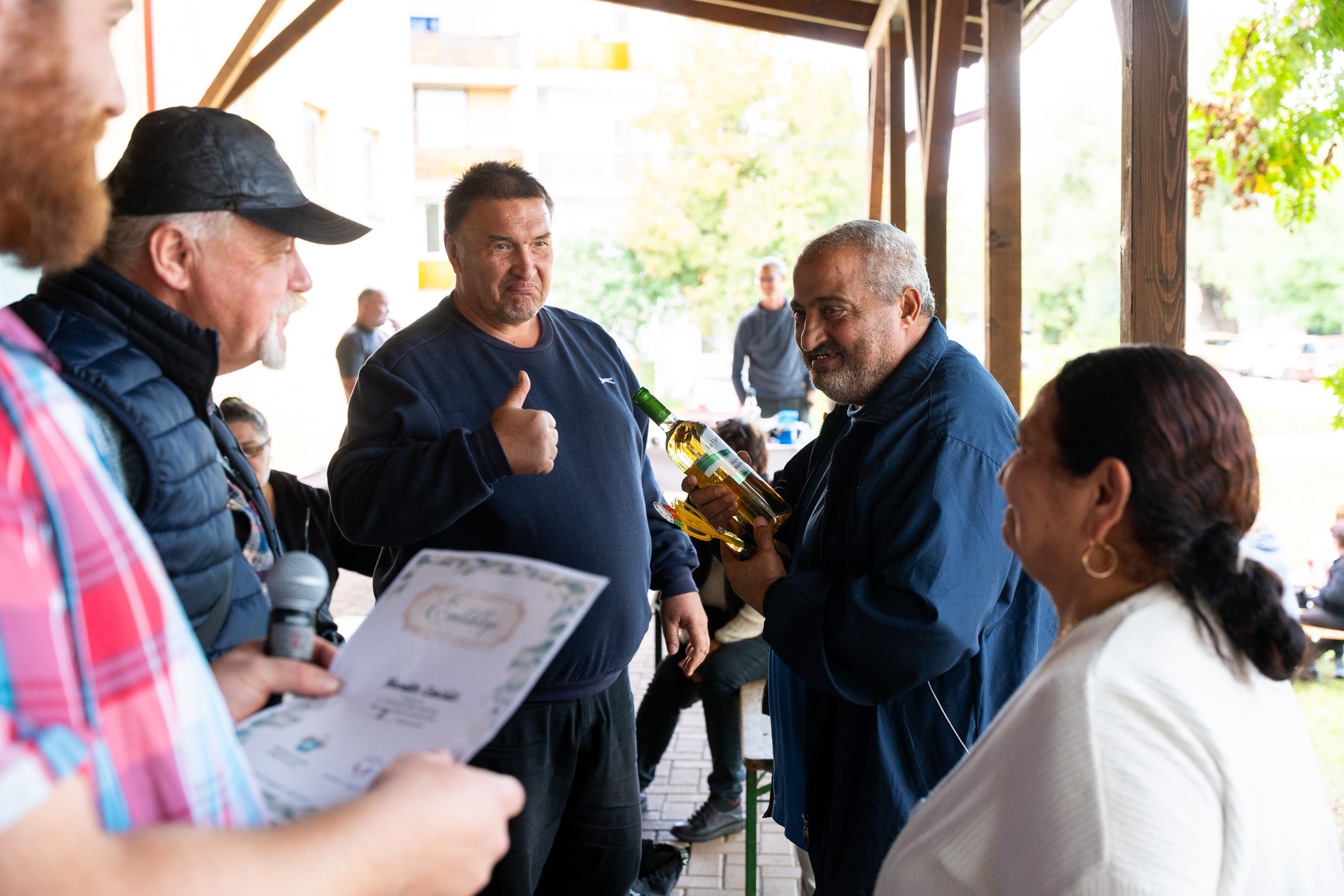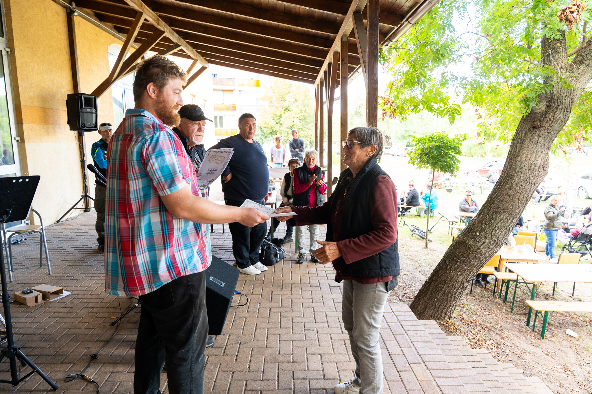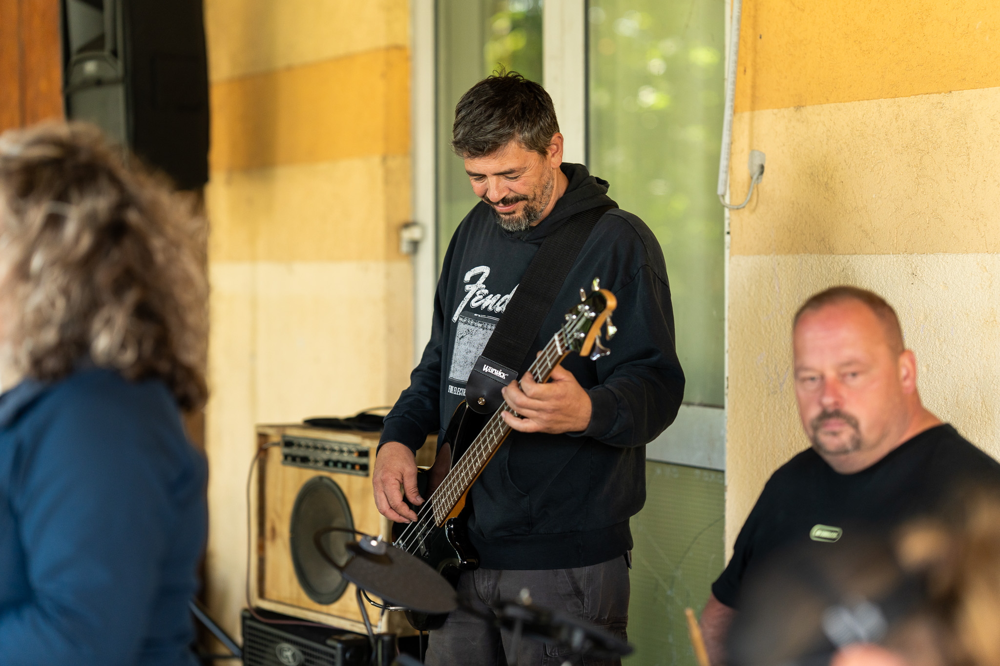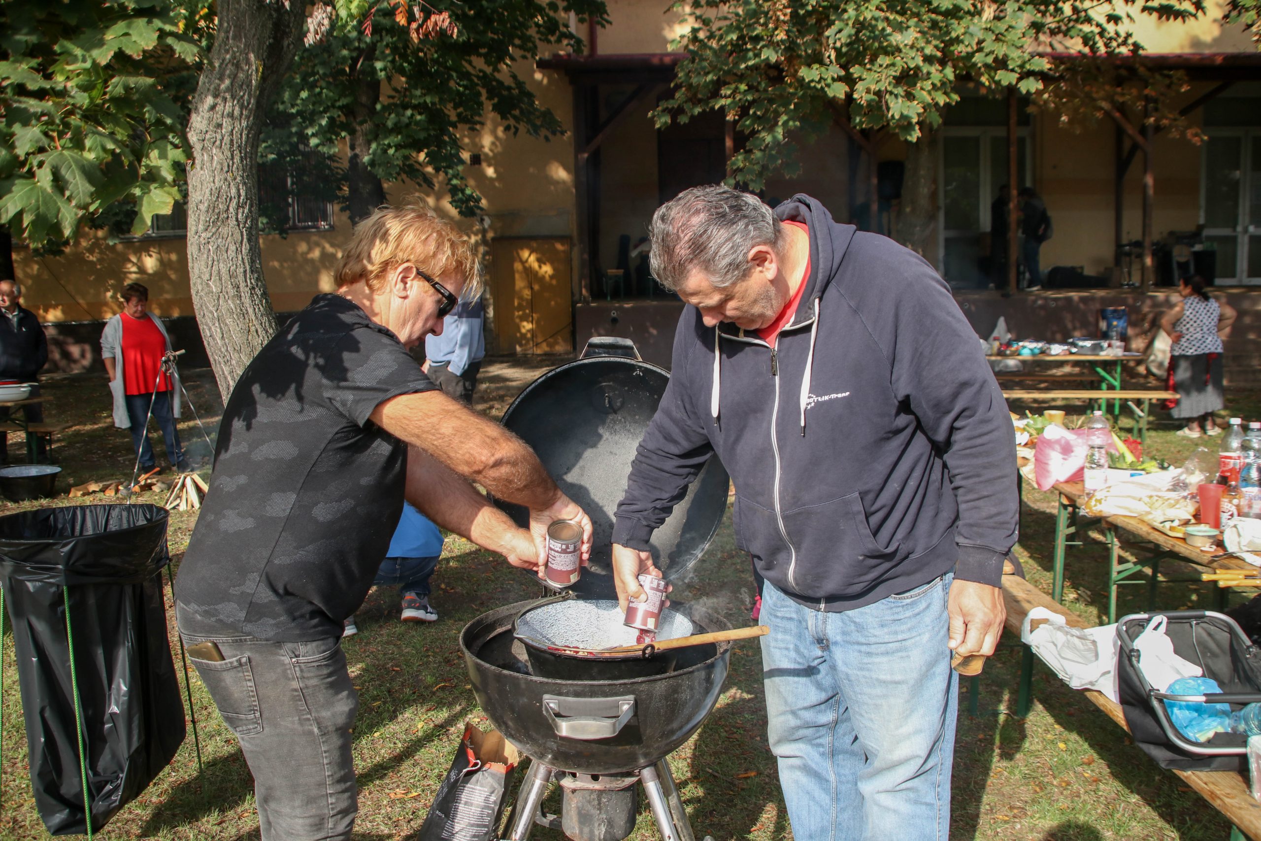 Közben a teraszon is megkezdődött a zenészek készülődése, hiszen idén is zenei csemegével készültünk a résztvevők számára. Tavaly Nagy Márton és Körösladányi Zoltán műsorát, valamint a munkásszállón lakó filippínó vendégmunkások zenéjét élvezhettük. Idén új formáció lépett fel: a Jatagán, a Gran’Gents, a Big Jump és a Bluzment zenekarok tagjaiból állt össze egy különleges csapat. Ők nemcsak zenéltek, hanem a főzőversenybe is beneveztek. Bár az ételüket nem kóstoltam, a zenei repertoárjukat imádtam – és remélem, ezzel nem voltam egyedül.